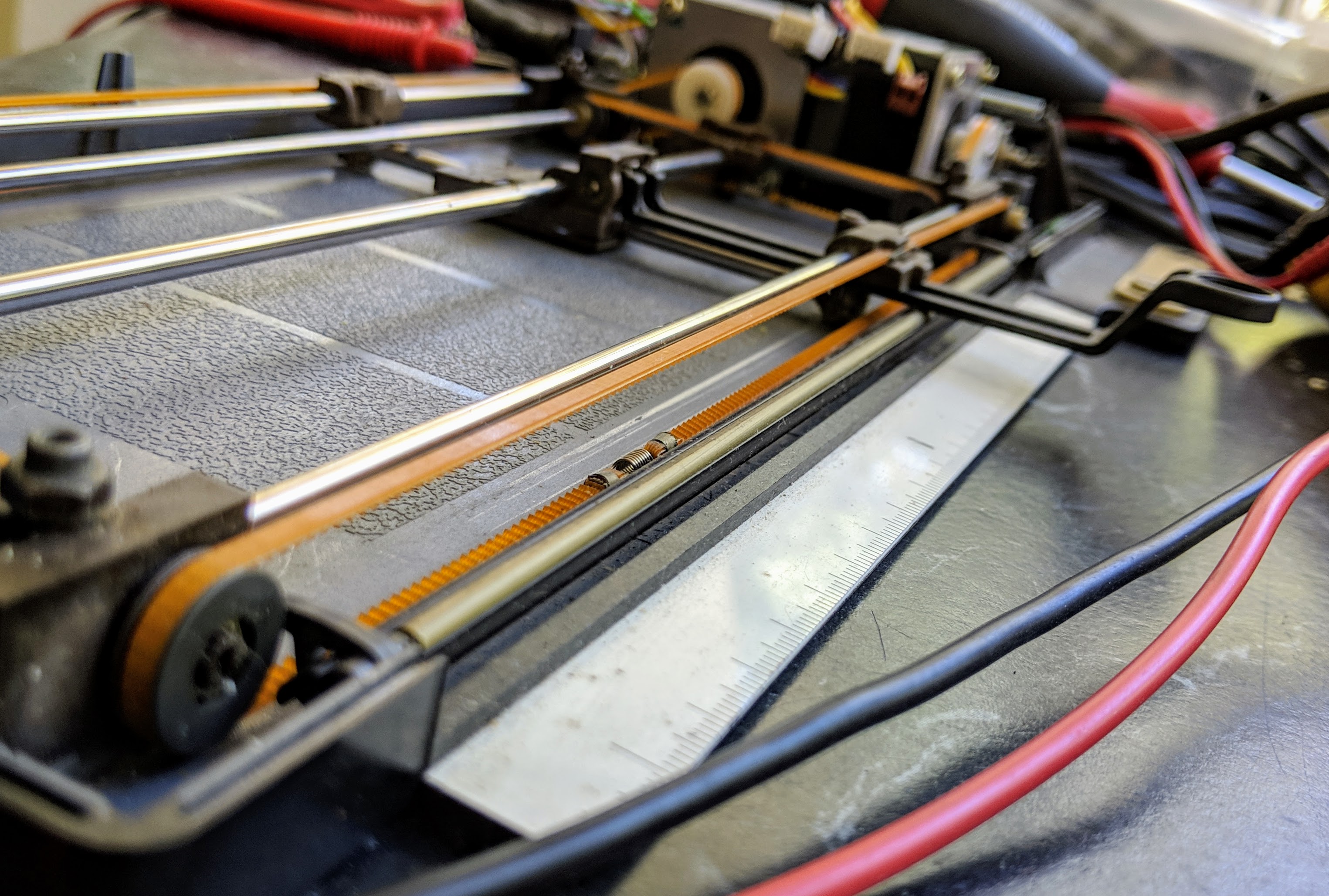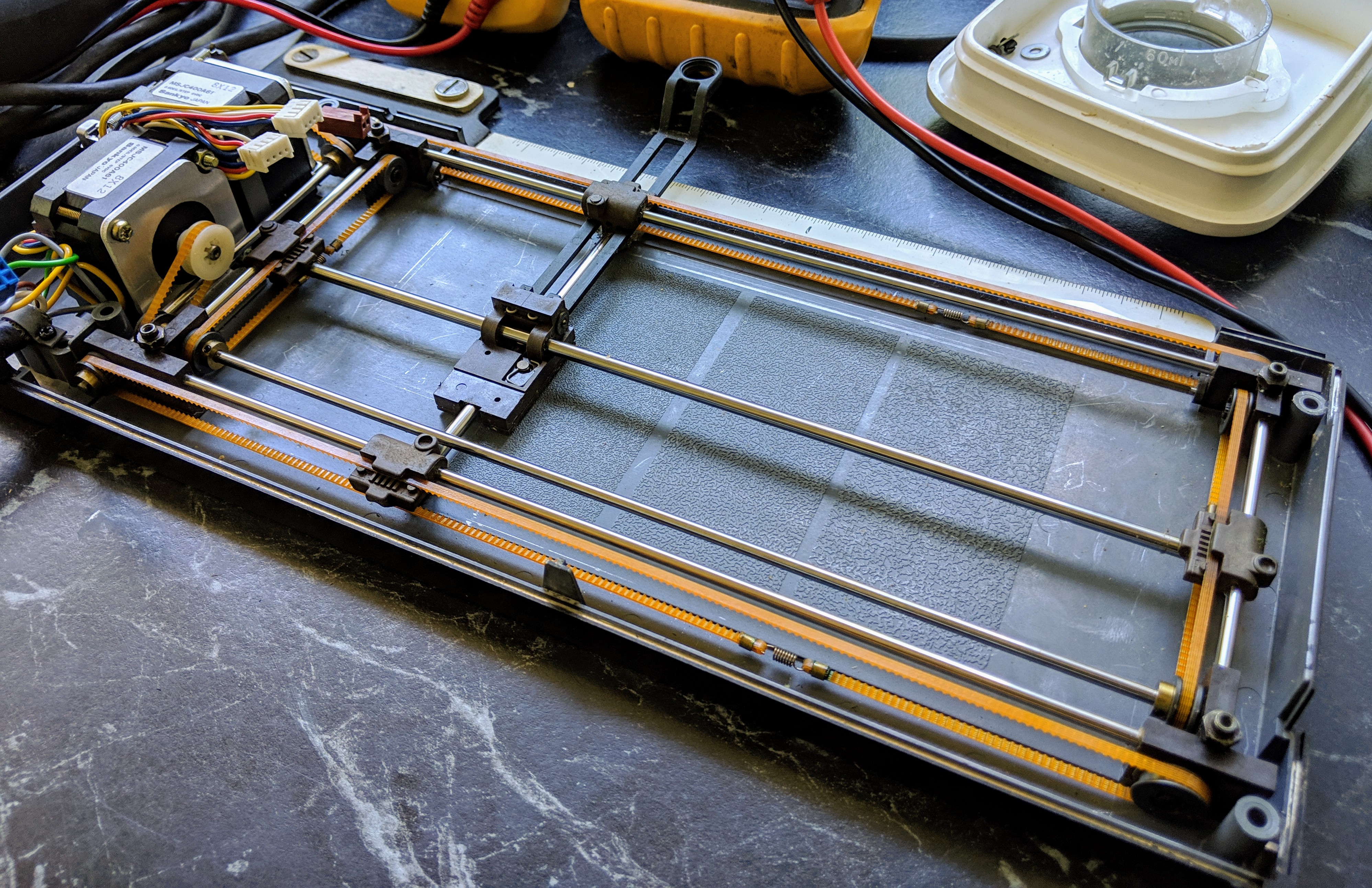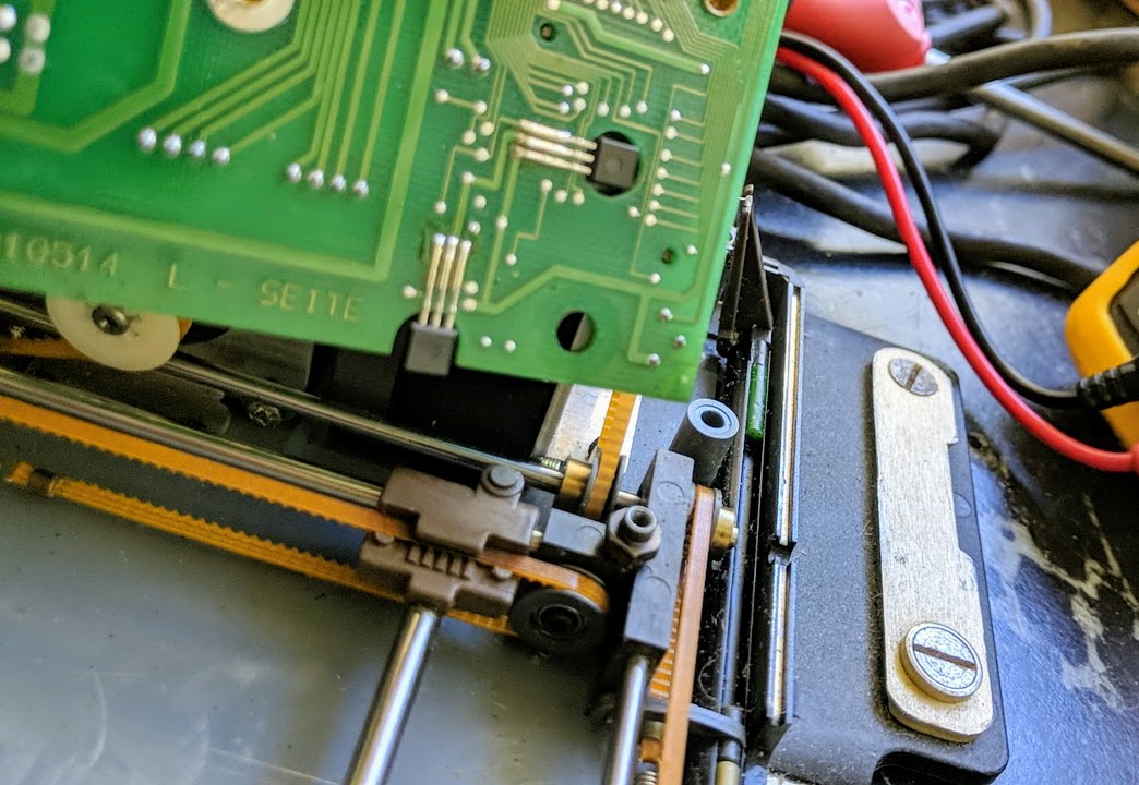 Very neatly packaged motion system under the mainboard.the underside of the mainboard shows the two hall effect sensors used to detect the position of the little round magnets mounted on in the brown plastic sliders of the x and y axes sliders.