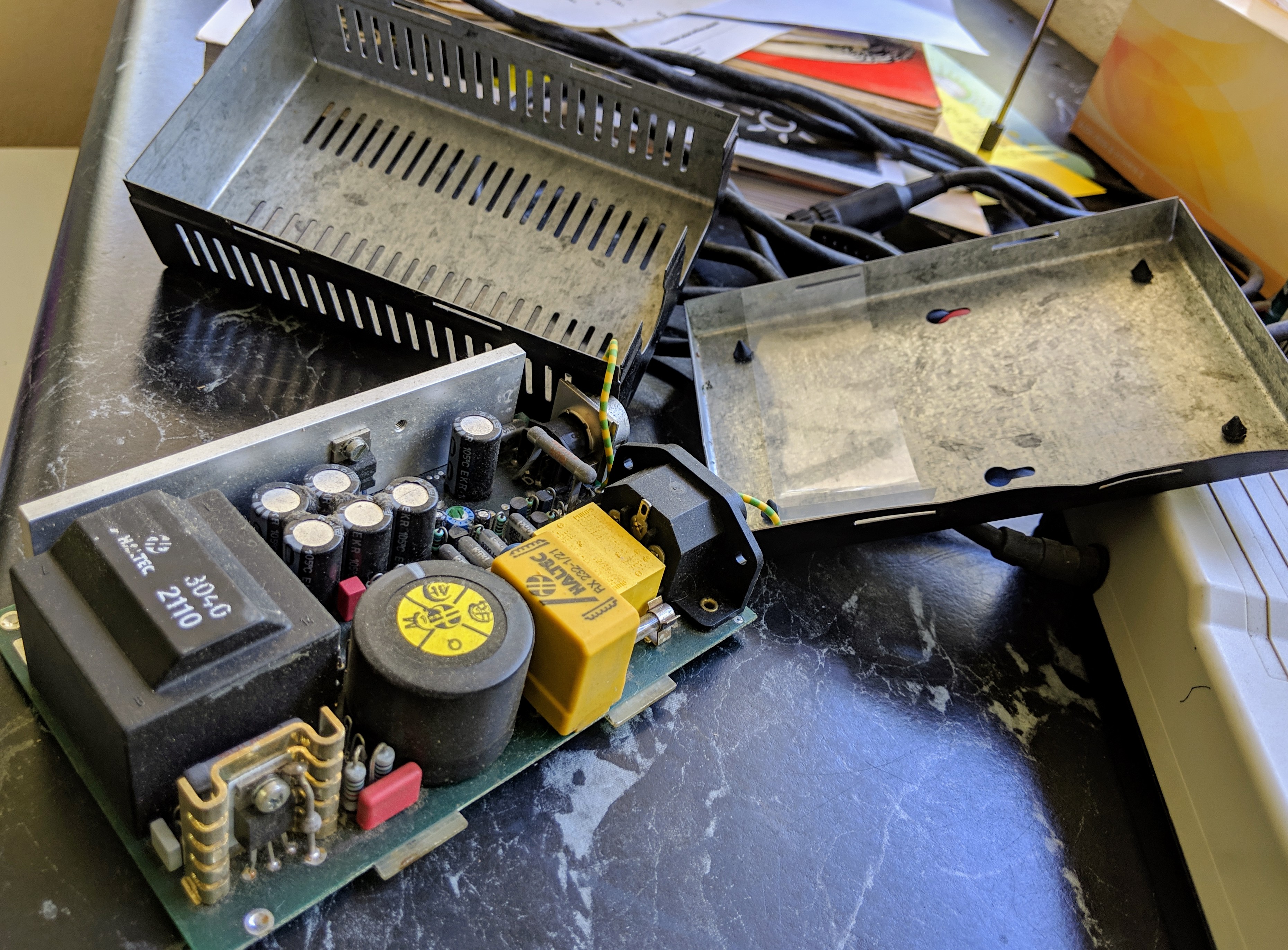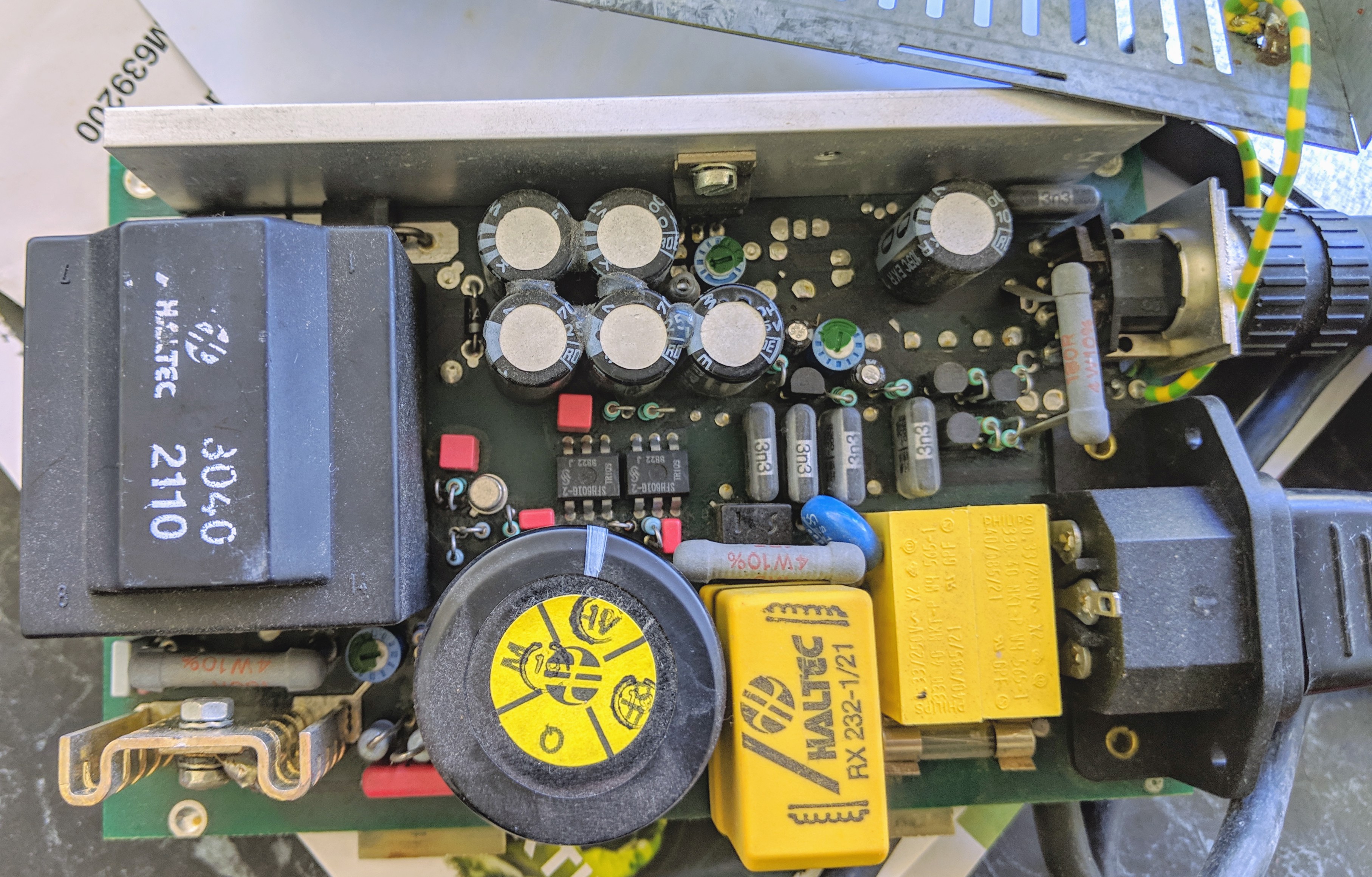 Worlds cheapest all metal enclosure. Two stamped sheets of steel hooked over tabs extending from the pcb. The metal is thin and the edges are sharp.Despite the cheap enclosure it looks like a decent quality Haltec brand power supply inside. Note the bare fibreglass tabs for the top and bottom covers to engage.