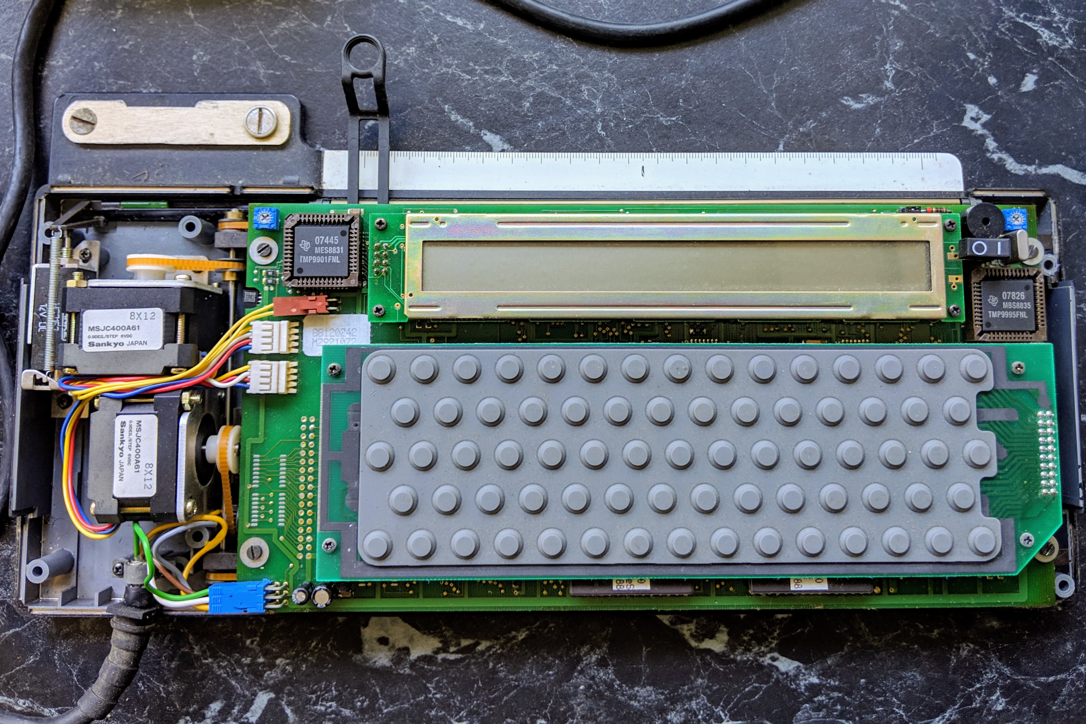 Electronics wise there is a large pcb and two daughter boards, one for the lcd and the other has carbon tracks for the membrane keypad. The mainboard does everything including driving the steppers and solenoid.