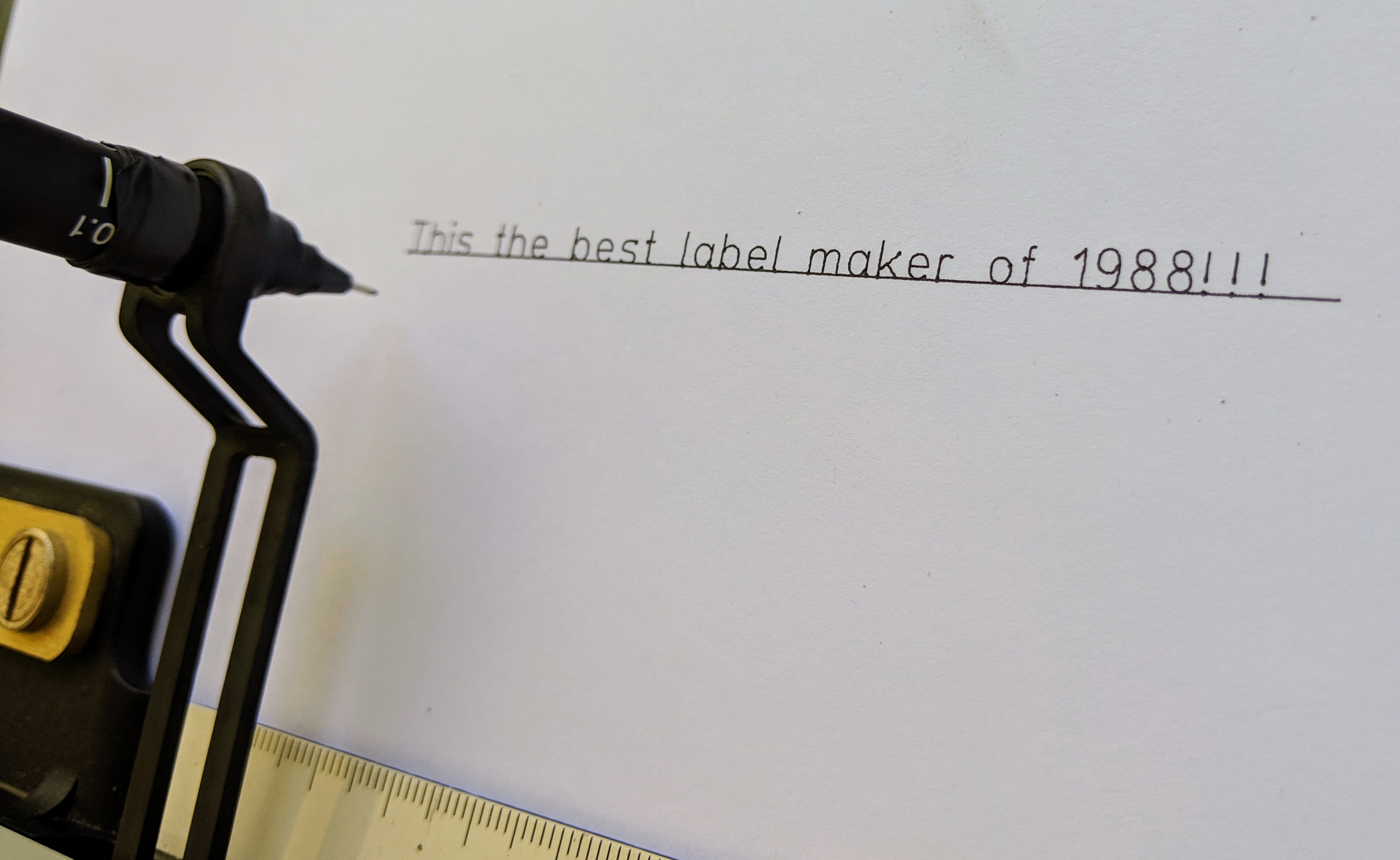 The oddest thing about the NC-scriber is the instant plotting. Unlike modern label makers which let you type your text, check it, then print the label. This thing puts pen to paper as soon as you hit the keys! Makes for cautious typing as you may notice in the videos.