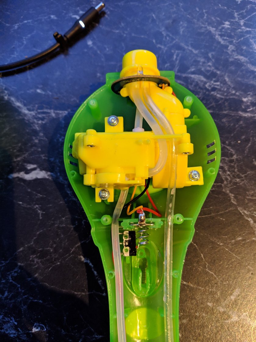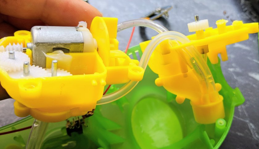 A single mabuchi 130 style motor drives the air blower, a peristaltic pump AND A little wiper in the nozzle that spreads the bubble fluid over the exhaust of the blower.