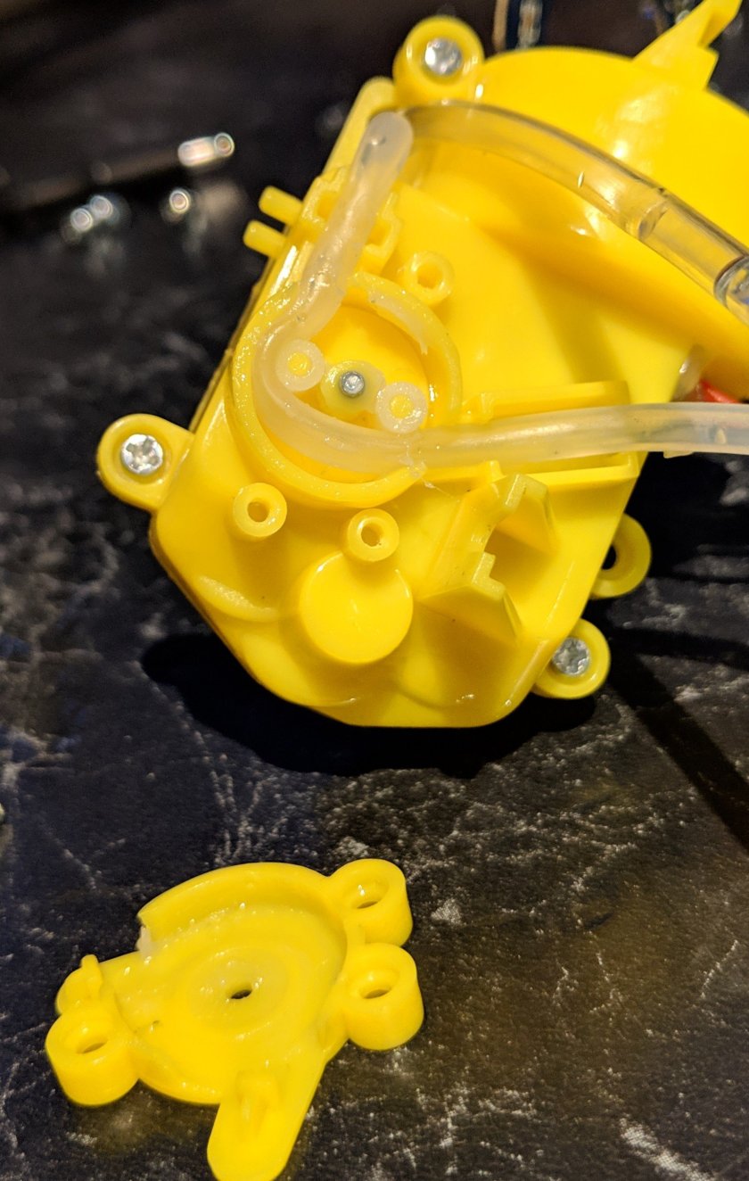I especially liked the use of a farm machinery style power take off with a flexible shaft made of the same silicone tubing as the intake hose. The return hose is cheaper vinyl as it doesn’t need the squishiness required for the intake hose to work inside the peristaltic pump.